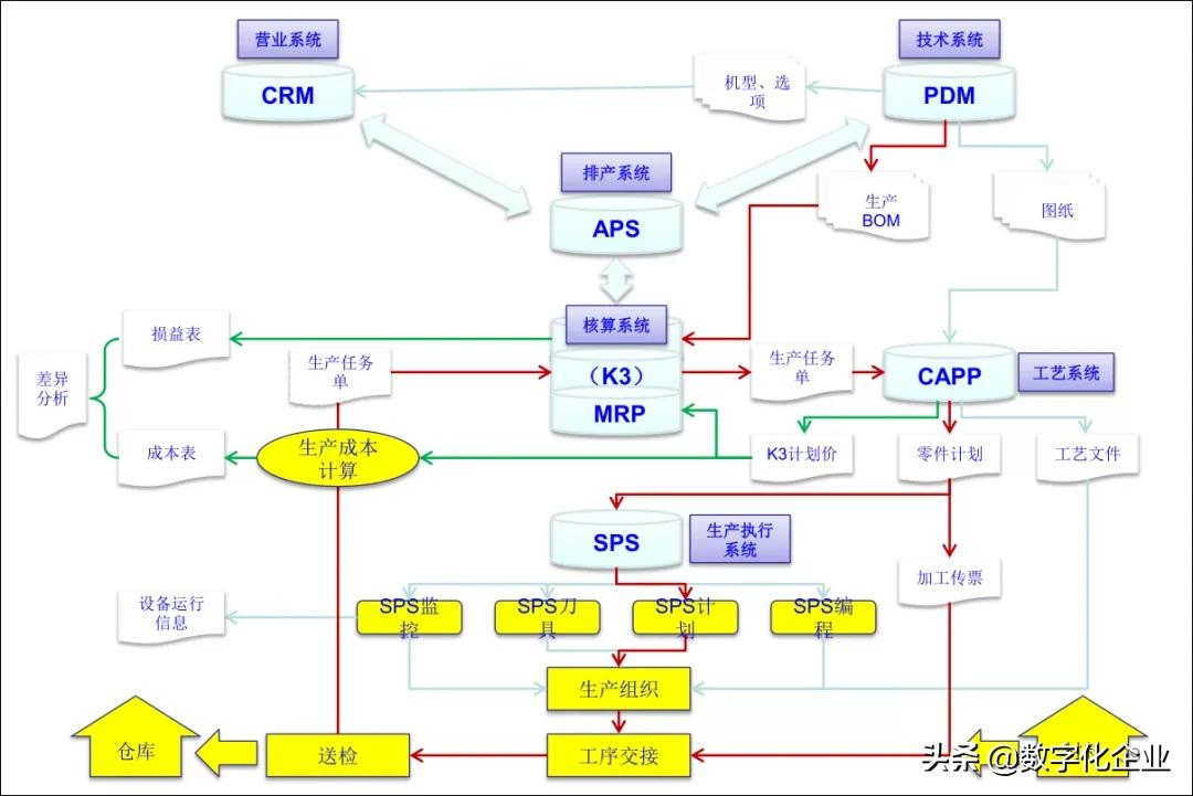 1)机床装备高端化主要包括高速高精加工,加工过程自动化(机器人取代操作工人),车间物流自动化(AGV自动配送混流物料),产品检测自动化(生产现场非接触光学自动检测、系统采集数据,及时反馈结果)。将数控机床接入企业信息化网络,连接CAD/CAM、MES、ERP、PPS以及PDM等信息化软件,如图11所示。